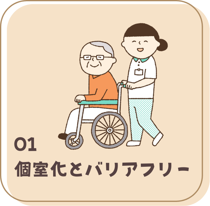 養護老人ホーム「静香園」は、青空のもと、広々した快適な住環境の中で自然の景観にマッチしたレンガ色✕白を基調にした南洋風の施設です。利用者がいつまでも自分らしく活き活きと暮らせるよう、6つの特色を持っています。