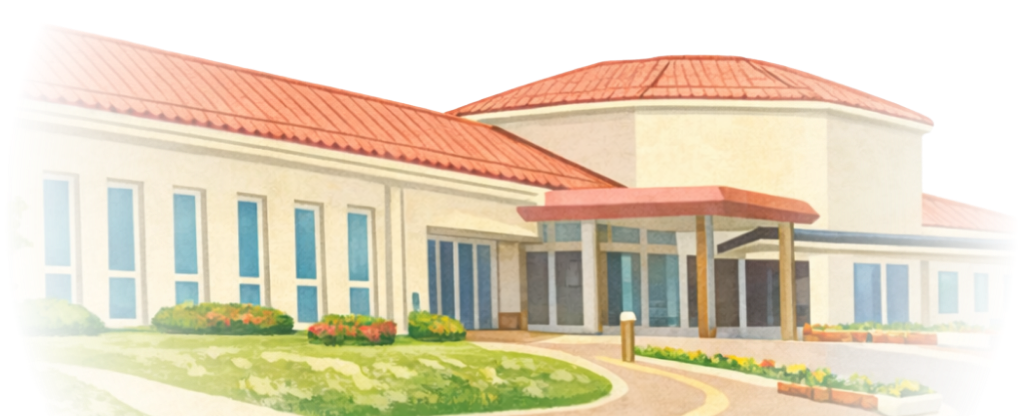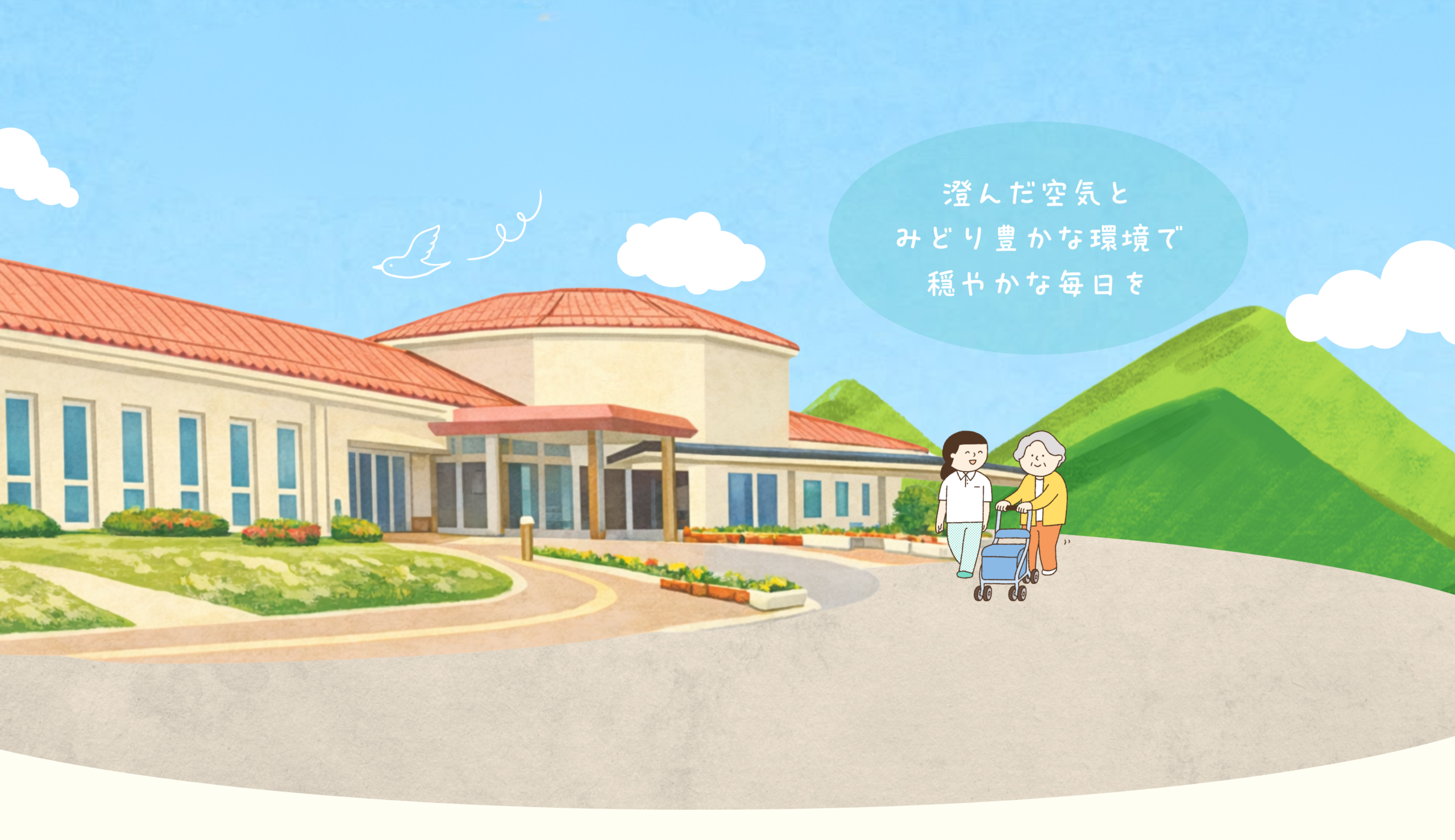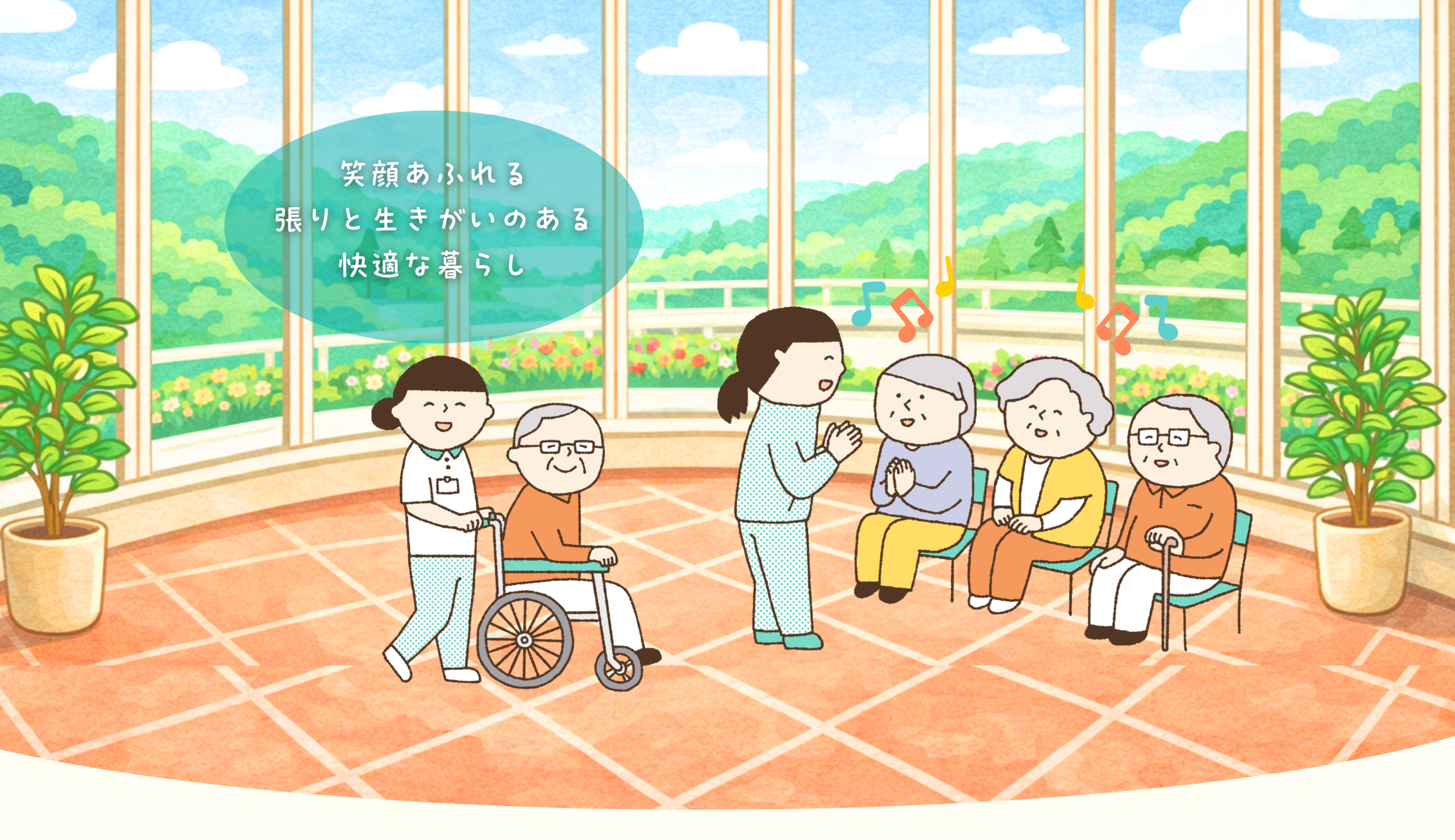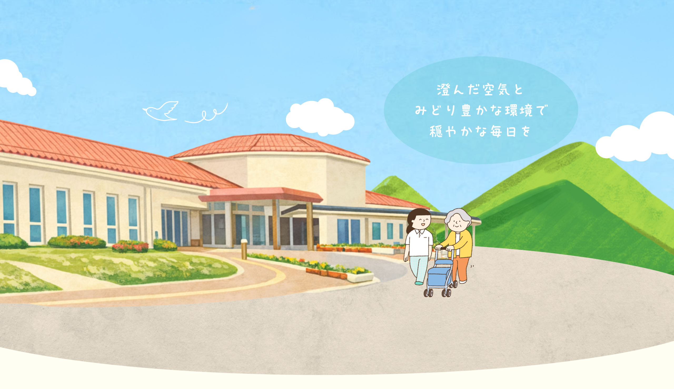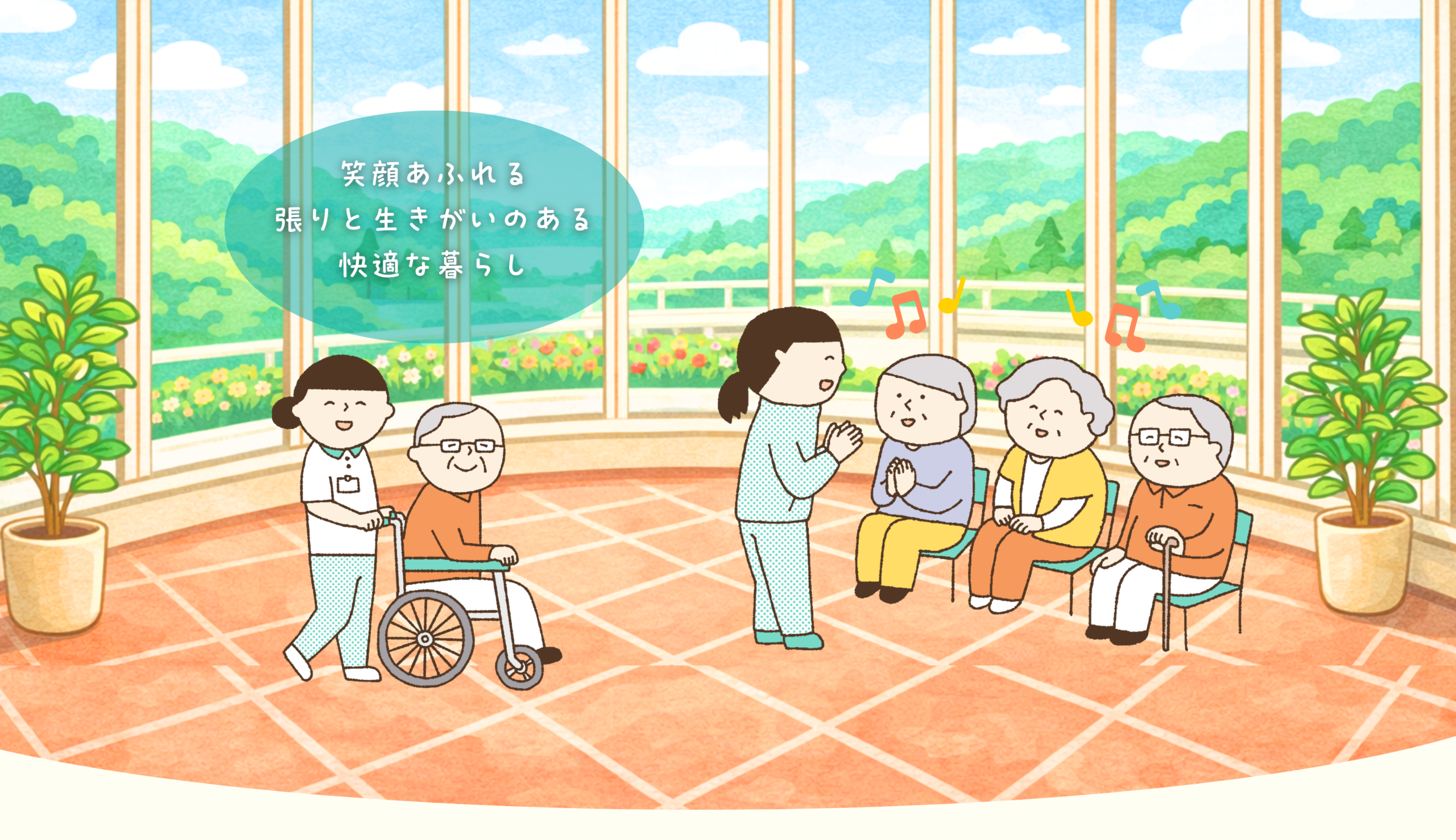 養護老人ホーム「静香園」は、青空のもと広々した快適な住環境の中で自然の景観にマッチしたレンガ色✕白を基調にした南洋風の施設です。利用者がいつまでも自分らしく活き活きと暮らせるよう、6つの特色を持っています。